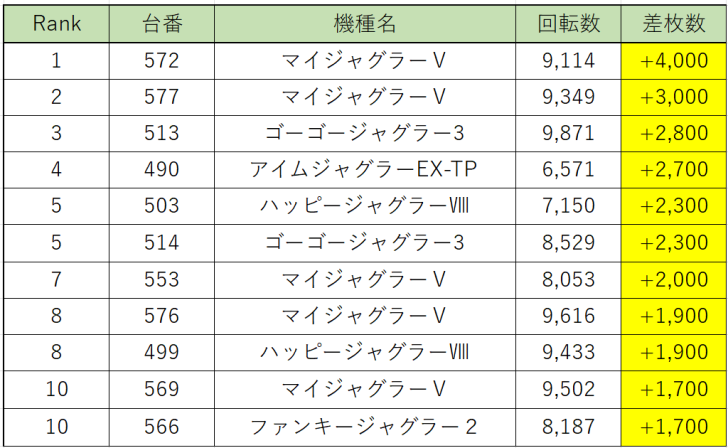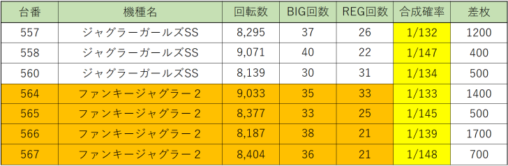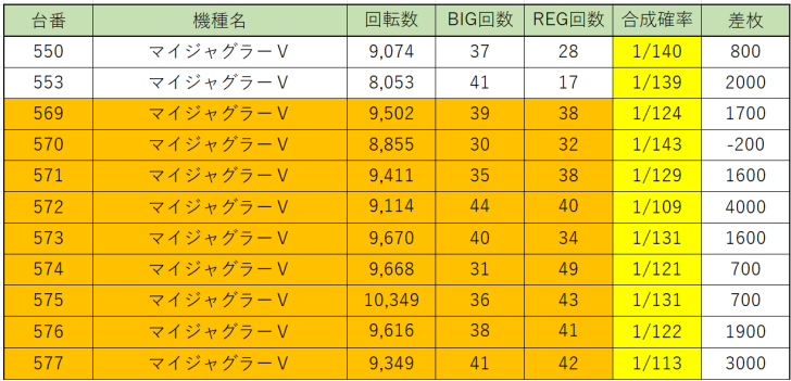 まずはみんな大好き『マイジャグラーⅤ』から569~577番台の9台並び、平均回転数9,504回転、総差枚+15,000枚、平均差枚+1,666枚、勝率88.9%!さすがハイスペックジャグラー!勝率も高いし出玉感もありますね!それに何よりもお店が頑張ってくれました!9台連続並びで間違いないでしょう!