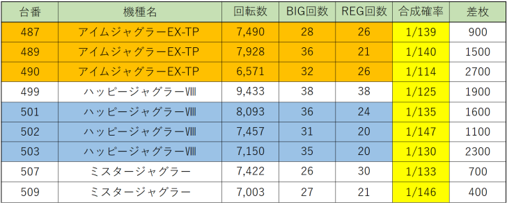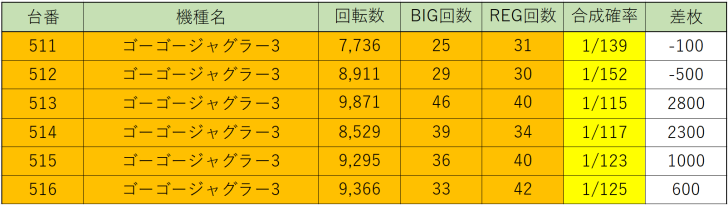 続いて『ゴーゴージャグラー3』511~516番台の6台並び、平均回転数8,951回転、総差枚+6,100枚、平均差枚+1,016枚、勝率66.7%、ジャグラーの中でも設定⑥の機械割が低い機種なのでマイナス差枚の台が出ても仕方ないですが、それでも6台中4台がプラス差枚と大健闘!