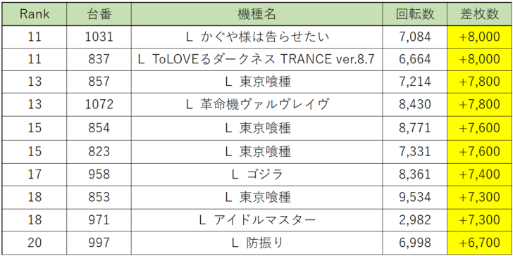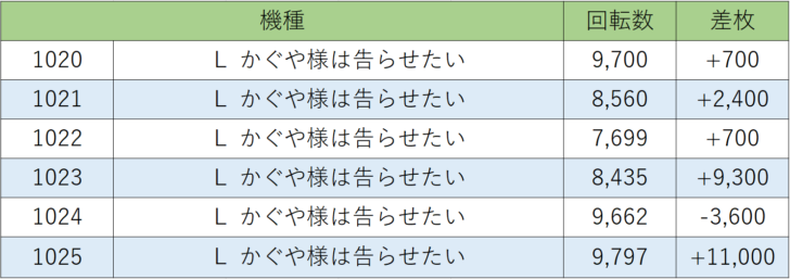 続いては、ホールのメイン機種として活躍中の『かぐや様』1020~1025番台、6台中5台プラス差枚、勝率83.3%!同じく『かぐや様』1028~1034番台、7台中6台プラス差枚、勝率85.7%!波の荒い機種なので大きく凹んでしまうこともありますが、+5,000枚、+8,000枚、+9,000枚、+万枚オーバー!と大量出玉を獲得してる台が複数あり、終日ぶん回されていることから仕掛けがあったのではないでしょうか。