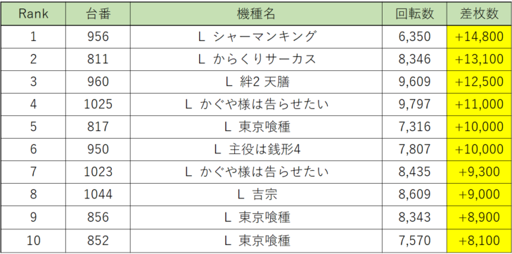 店内出玉ランキングでは、なんと設置台数1台の『シャーマンキング』956番台が差枚+14,800枚でランキング1位を獲得!同じく設置台数1台の『絆2 天膳』960番台も差枚+12,500枚で3位にランクイン。こういうところに新店長の遊び心が見え隠れしていて、悪番でも全機種全台にチャンスがあったように思われます。