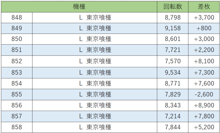 まずは、スロットコーナーから大人気機種『東京喰種』821~825番台、5台中4台プラス差枚、勝率80.0%!同じく『東京喰種』848~858番台、11台中10台プラス差枚、勝率90.9%!!当日店内にいた人はもちろんのこと、データをみれば一目瞭然!2周年という節目に新店長就任のド派手な仕掛けをしたのかもしれませんね。とても素晴らしい結果を残しました。