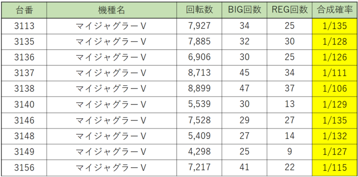 まずは多台数設置のみんな大好き『マイジャグラーⅤ』、7,000G、8,000Gと回されてる台も多く、ボーナス合成確率が非常に良い台も複数ありました。