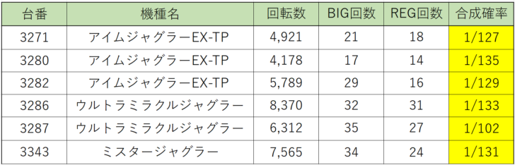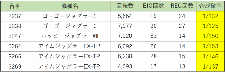 続いて『ゴーゴージャグラー3』『アイムジャグラーEX-TP』とボーナス合成確率の良いが多く見受けられました。