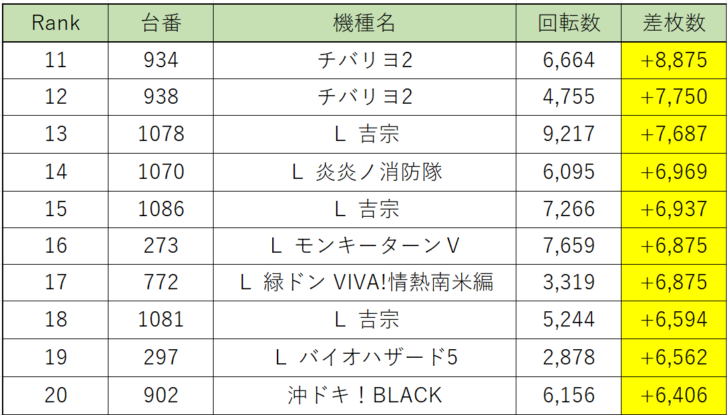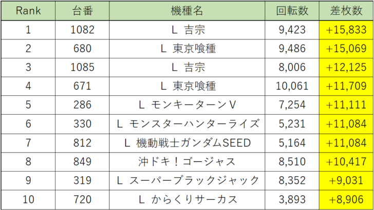 店内出玉ランキングでは、『吉宗』1082番台が差枚+15,833枚の大爆発でランキング1位を獲得!続いて『東京喰種』680番台が差枚+15,069枚で2位。店内いたるところの機種がランクインしていることから最低でも機種イチで内容の良い台があったんではないでしょうか。