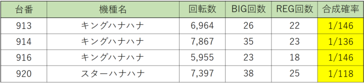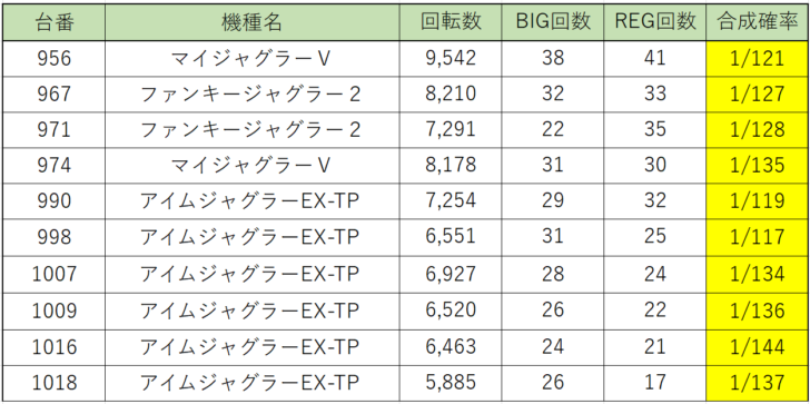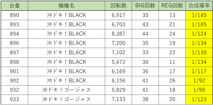 そして沖スロシリーズは、台の内容は分かりずらいですが、『沖ドキ』が7,000G、8,000Gと当たり前にぶん回されていることから普段から状況が良いのが見えてきます。関東はジャグラーが強いの対して東海地方は沖スロが強いのかもしれません。