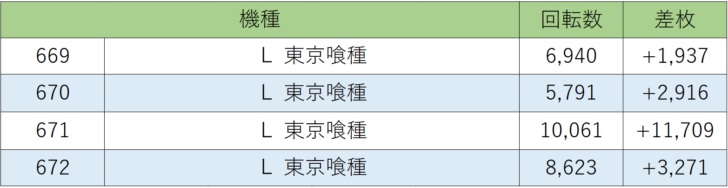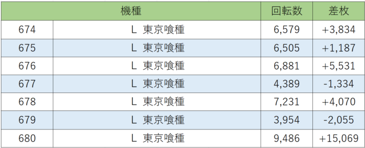 お次は大人気機種『東京喰種』669~672番台、4台中4台プラス差枚、勝率100.0%!!同じく『東京喰種』から674~680番台、7台中5台プラス差枚、勝率71.4%!+3,000枚、+4,000枚は当たり前、大爆発の万枚オーバーも2台ありました。やはり大人気機種に仕掛けを作ってきたのかもしれませんね。