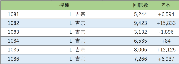 まずは『ゆうちゃろ』も実践した機種『吉宗』1081~1086番台、6台中5台プラス差枚、勝率83.3%!内容の良い台でもヒキが伴わないと大きく凹んでしまう機種ですが、マイナス差枚の台以外は全台終日ぶん回されて、+6,000枚、+万枚オーバーが複数と衝撃的な出玉状況でした。ここに仕掛けがあった可能性が高いです。