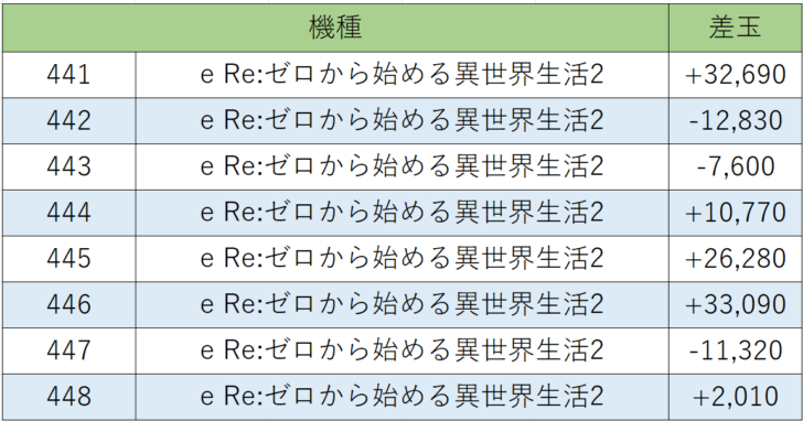 さらに人気機種『eRe:ゼロ2』からも441~448番台、8台中5台プラス差玉、勝率62.5%!上々の結果を残しました。