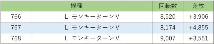 お次は山佐の人気機種『モンキーターンⅤ』766~768番台、3台中3台プラス差枚、勝率100.0%!!全台差枚+3,000枚以上!上を打っていてもなかなかこんな結果になることはないのでプレイヤーも猛者たちばかりだったのでしょう。