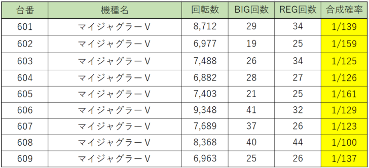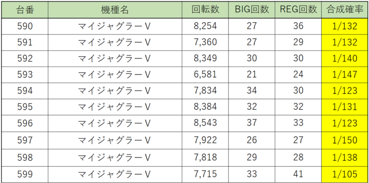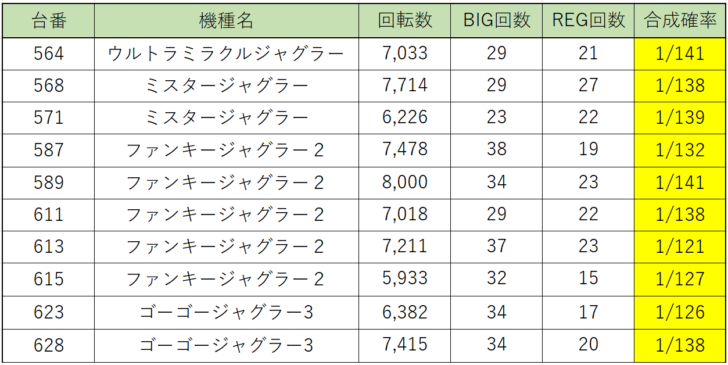 ジャグラーシリーズからは、特に『マイジャグラーⅤ』からボーナス合成確率の良い台が大量に出現!もしかしたら仕掛けがあったのかもしれませんね!『アイムジャグラー』等からもボーナス合成確率の良い台が多数見受けられたのでジャグラーの状況は極めて良かったと思われます。