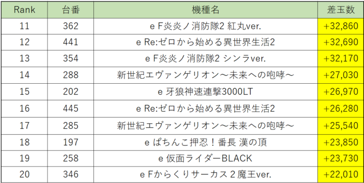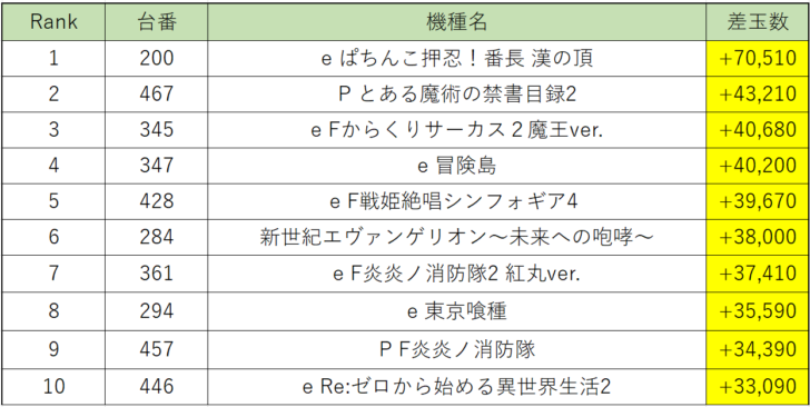 パチンコ店内出玉ランキングでは、1位『ぱちんこ押忍!番長』200番台が差玉+70,000発オーバーの大爆発!続いて『Pとある魔術の禁書目録2』が差玉+43,000発オーバー、『からくりサーカス2魔王』が差玉+40,000発オーバーと大量出玉を獲得していました!