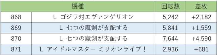 続いては『ゴジエヴァ』~『アイドルマスター』の機種跨ぎ868~871番台、4台中4台プラス差枚、勝率100.0%!!特に注目すべきなのは『七つの魔剣』2台がぶん回されて1台は差枚+4,500枚オーバーと優秀な結果を残しました。誰も狙わなそうなところに入れてくるところに『走る店長』の遊び心が感じられますね。