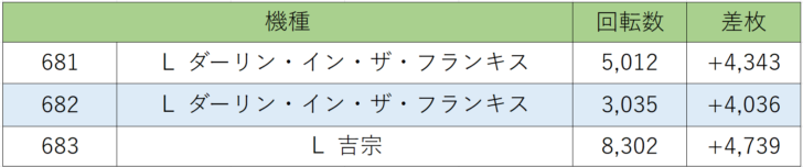 まずはスロットコーナーから最新台『ダーリン・イン・ザ・フランキス』~『吉宗』の機種跨ぎ681~683番台、3台中3台プラス差枚、勝率100.0%!!2機種とも波が荒いので上でも凹んでしまうことがありますが、全台プラス差枚+4,000枚以上と素晴らしい結果を残しました。