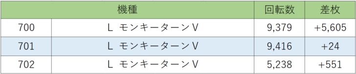 お次は人気機種『モンキーターンⅤ』700~702番台、3台中3台プラス差枚、勝率100.0%!!派手な出玉感はありませんが701番台は差枚ほぼプラマイゼロなのですが9,000回転以上も回っていることから、憶測ですが終日粘りたくなる内容の台だったのかもしれません。
