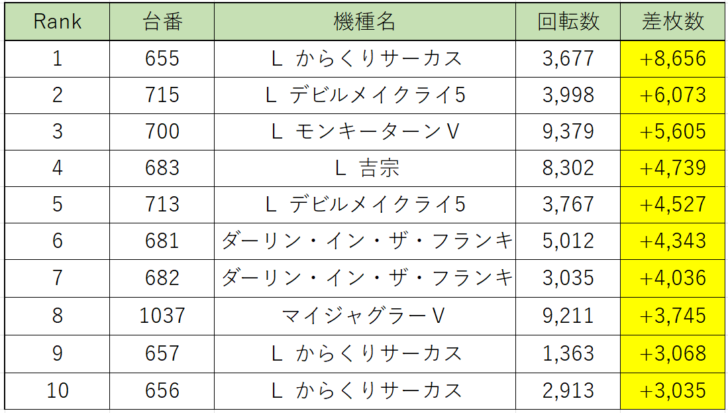 スロット店内出玉ランキングでは、『からくりサーカス』655番台が差枚+8,656枚で1位!次いで『デビルメイクライ5』715番台が差枚+6,073枚で2位、『モンキー』700番台が差枚+5,605枚で3位にランクイン。