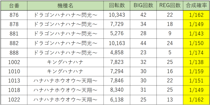 東北地方といえばハナハナシリーズも盛んな土地で有名ですが、今回もボーナス合成確率の良い台が複数ありました。『ドラハナ』は1/3位、『ホウオウ』は1/2位でプラス差枚でした。
