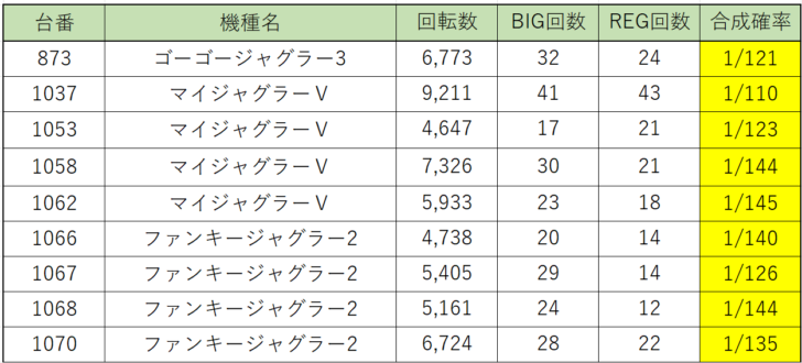 ジャグラーシリーズからは『ファンキージャグラー』からボーナス合成確率の良い台が多数出現!反応してない台もあったので確信は持てませんが、もしかしたら丸ごと機種だったのかもしれません。その他『ミスタージャグラー』も3/4台でプラス差枚でした。