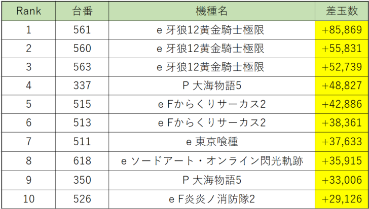 パチンコ店内出玉ランキングでは、『牙狼12』561番台が差玉+85,869発と大爆発でランキング1位を獲得!続いて同じく『牙狼12』560番台が差玉+55,831発、『牙狼12』563番台が差玉+52,739発と3位までを『牙狼12』が独占しました。