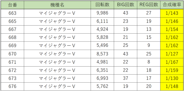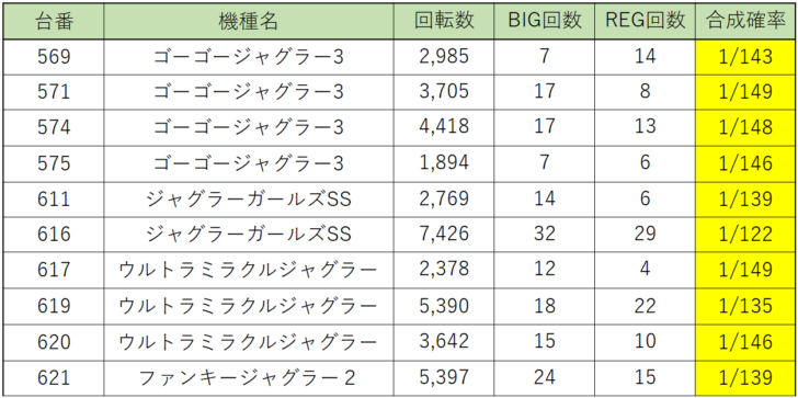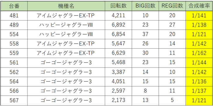 まずは多台数設置機種のみんな大好き『マイジャグラーⅤ』からボーナス合成確率の良い台が多数見受けられました。同じく多台数設置機種の『ゴーゴージャグラー3』からもボーナス合成確率の良い台が多数ありましたが、残念ながら全然回っていなかったのでボーナス回数はついていませんでした、もっと回っていれば回数も出玉もついてきたいたかもしれません。