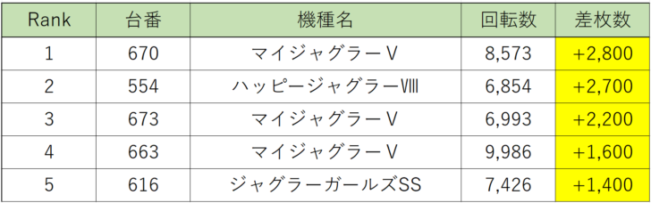 ジャグラー店内出玉ランキングでは、『マイジャグラーⅤ』670番台が差枚+2,800枚でランキング1位を獲得!『ハッピージャグラーⅧ』554番台が差枚+2,700枚で惜しくも2位。少数設置機種の『ジャグラーガールズSS』616番台がランキング5位に入っていることから全てのジャグラー機種にチャンスがあったように思われます。