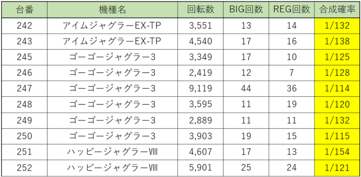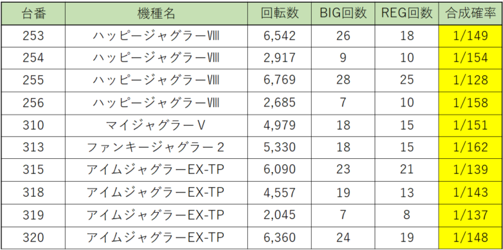 まずは『ゴーゴージャグラー3』、回ってない台もあるのでマイナス差枚の台もございますが、ボーナス合成確率の良い台が多く、かなり状況が良かったと思われます。