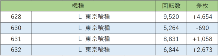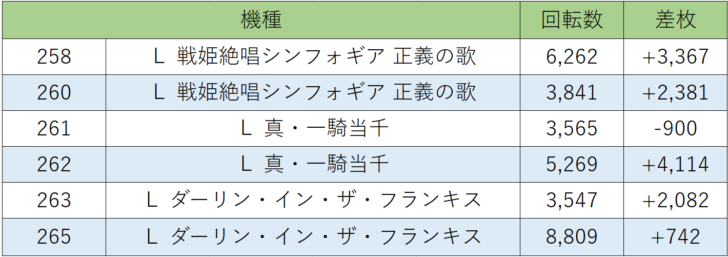 まずは『たなちゅう』も実践していた機種『戦姫絶唱シンフォギア正義の歌』~『ダーリンインザフランンキス』の機種跨ぎ258~265番台、6台中5台プラス差枚、勝率83.3%!!今ではホールで見ることも少なくなった『シンフォギア』、そして『東京喰種』に続くスパイキーの最新台『ダーリンインザフランンキス』、どちらも設定よりもアームが必要な機種なのですがしっかり回されてプラス差枚なので仕掛けがあったのかもしれません。