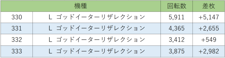 お次は山佐の人気機種『ゴッドイーターリザレクション』330~333番台、4台中4台プラス差枚、勝率100.0%!!そこまで回っていませんが+2,000枚以上、+5,000枚以上と全台プラス差枚!内容の良い台でも然るべき時に然るべき役をひけないと出ない機種なので打ち手はアームも強かったんでしょう。