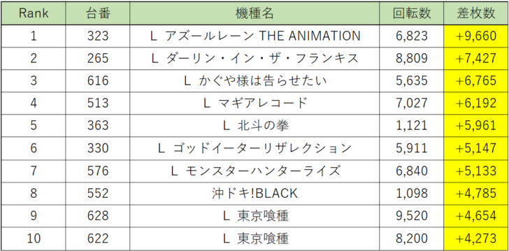 店内出玉ランキングでは、最新台『アズールレーン』323番台が差枚+9,660枚でランキング1位を獲得!続いてこちらも最新台『ダーリンインザフランンキス』265番台が差枚+7,427枚で2位と新台にも力を入れているお店なのかもしれません。