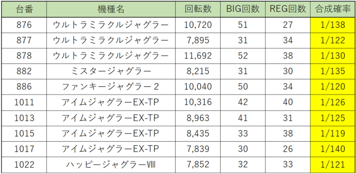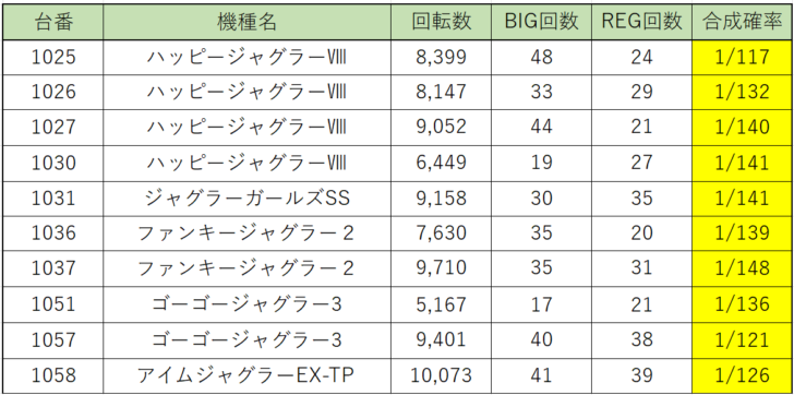 お次は『ハッピージャグラーⅧ』こちらも8,000回転、9,000回転回されてボーナス合成確率の良い台が複数あることから普段から状況が良いのかもしれません。