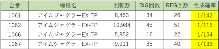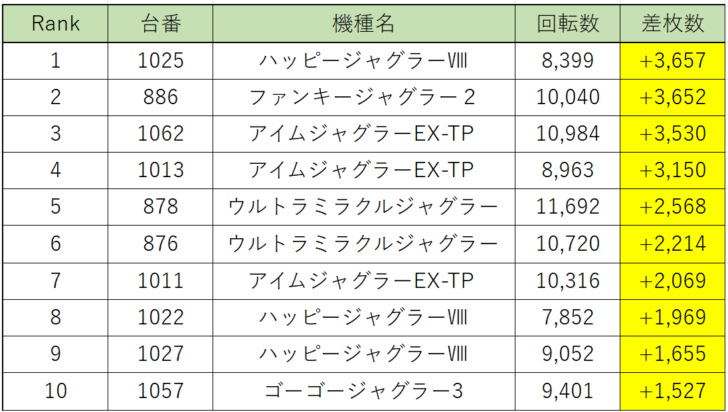ジャグラー店内出玉ランキングでは、『ハッピージャグラーⅧ』1025番台が差枚+3,657枚でランキング1位!『ファンキージャグラー2』886番台は差枚+3,652枚のわずか5枚差で惜しくも2位、そして96ペカをした『アイムジャグラー』1062番台がこちらも差枚+3,530枚の僅差で3位にランクイン。