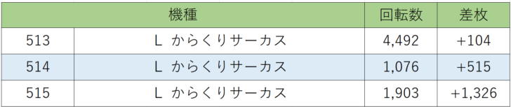 お次は『からくりサーカス』513~515番台、3台中3台プラス差枚、勝率100.0%!!グラフを見る限りプラス域に上がったら即やめしてる感じですが、下だとなかなかプラス差枚にするのも難しい波の荒い機種なので仕掛けがあったのではないでしょうか。