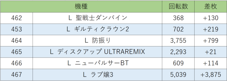 まずはバラエティコーナー『ダンバイン』~『ラブ嬢3』の機種跨ぎ462~467番台、6台中6台プラス差枚、勝率100.0%!!あまり回ってはいませんが、大抵のお店では朝イチリセットだけみて捨てられる『ラブ嬢3』が5,000回転以上も回って大幅なプラス差枚ということは何か強い示唆が出て粘った可能性が高いと判断もできます、加えて全台プラス差枚、確信は持てませんがもっと回っていれば結果は変わっていたのかもしれません。