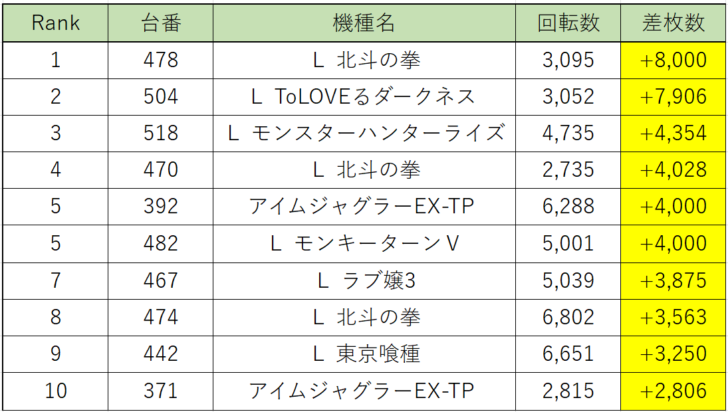 店内出玉ランキングでは、『北斗の拳』478番台が差枚+8,000枚でランキング1位を獲得!次いで2位『ToLOVEる』504番台が差枚+7,906枚、『モンハンライズ』518番台が差枚+4,354枚で3位にランクイン。スロットの設置台数に関わらずお店は頑張ってくれたように思われます。