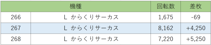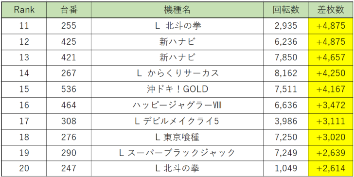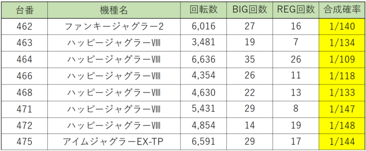 ジャグラーシリーズからは『ファンキージャグラー』の状況が良く、しっかり回っている台は全台プラスと回っていない台も回っていればもっと良い結果になっていたのかもしれません。他にも『ハッピージャグラー』が1/2位でボーナス合成確率の良い台がありました。
