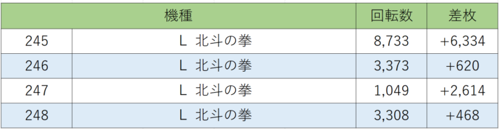 お次は多台数設置のメイン機種『北斗の拳』245~248番台、4台中4台プラス差枚、勝率100.0%!!245番台は初当たり21回とっててしっかり差枚+6,000枚と出玉もついていたので上で間違いないと思いますが、他の台はそこまで回っていなかったので確信は持てませんが全台プラス差枚と優秀な結果を残していたので仕掛けがあった可能性が高いと思われます。