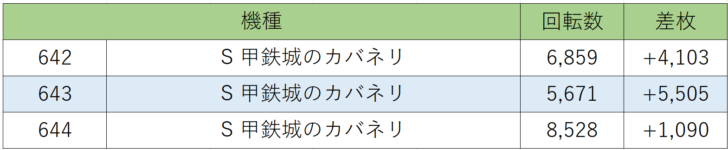 そして今も大事に使っているホールが多い『カバネリ』642~644番台、3台中3台プラス差枚、勝率100.0%!!全台しっかり回って差枚+4,000枚、+5,000枚と大量出玉を獲得している台が複数、状況的にお店が大切に扱っている機種なんでしょう。