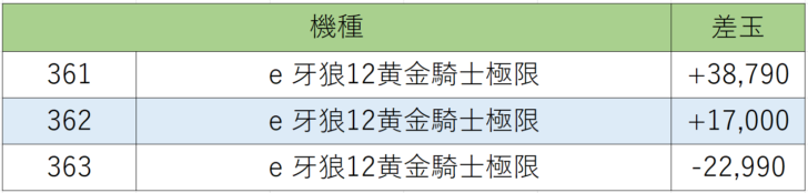 続いてパチンココーナーからはサンセイの『牙狼12黄金騎士極限』361~363番台、3台中2台プラス差玉、勝率66.7%!