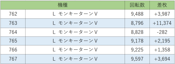 まずはスロットコーナーから人気機種『モンキーターンⅤ』752~759番台、8台中8台プラス差枚、勝率100.0%!!一目瞭然!全台大幅プラス差枚、そしてこれだけではありません762~767番台、6台中5台プラス差枚、勝率83.3%!!残念ながら764番台はマイナス差枚でしたがそれでも8,000回転以上回っているので周りの状況からぶん回されたのでしょう。様々な角度からみてもこの状況はまるごど機種だった可能性が高いと思われます。