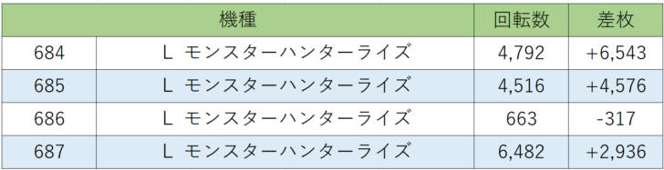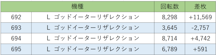 お次は『ゴッドイーターリザレクション』692~695番台、4台中3台プラス差枚、勝率75.0%!『モンキー』に引き続きこちらも山佐機種、出玉がヒキに左右されますが差枚+4,000枚、+万枚オーバーと大量出玉を獲得している台が複数あり、素晴らしい結果を残しました。『モンキー』と同じ山佐機種であることから山佐機種に仕掛けがあったのかもしれませんね。
