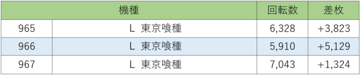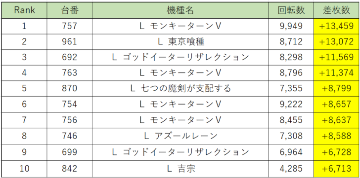 スロット店内出玉ランキングでは、『モンキー』757番台が差枚+13,459枚でランキング1位を獲得!次いで『東京喰種』961番台が差枚+13,072枚の僅差で2位、『ゴッドイーター』692番台が差枚+11,569枚で3位にランクインしました。
