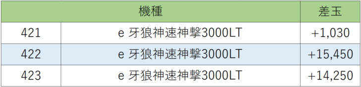 続いてもサンセイの『牙狼神速神撃』421~423番台、3台中3台プラス差玉、勝率100.0%!!以上の結果からサンセイ機種の状況が良かったです。
