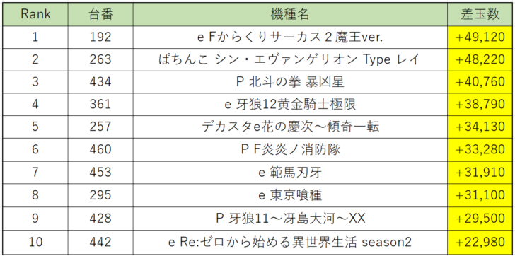 パチンコ店内出玉ランキングでは、『からくりサーカス2魔王』192番台が差玉+49,120発の大量出玉を獲得でランキング1位!次いで『シン・エヴァ』263番台が差玉+48,220発で2位、『北斗の拳 暴凶星』434番台が差玉+40,760発で3位となりました。
